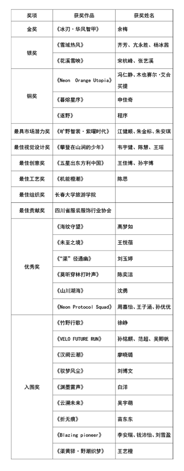 随着大家对于健康生活理念的推崇,越来越多的人在空余时间选择户外/轻户外运动。甚至“冲锋衣”也成为了许多都市人统一的“城市服装”。一个被命名为“中国户外纺织服装名城”的地方——四川渠县,在金秋时节不仅迎来了作物丰收,也迎来了户外服装设计人才的创意碰撞与作品展演。11月11日晚,首届中国(渠县)户外纺织服装AI设计大赛决赛暨颁奖典礼圆满落幕。选手余梅的作品《冰刃·华风智甲》斩获金奖;选手齐芳、亢永胜、杨冰茜的作品《雪域热风》、选手宋杭峰、张艺溪的作品《花溪雪映》获得银奖;选手冯仁静、木也赛尔·艾合买提的作品《NeonOrange Utopia》,选手申佳奇的作品《暮熔星序》,选手程序的作品《逐野》捧得铜奖。