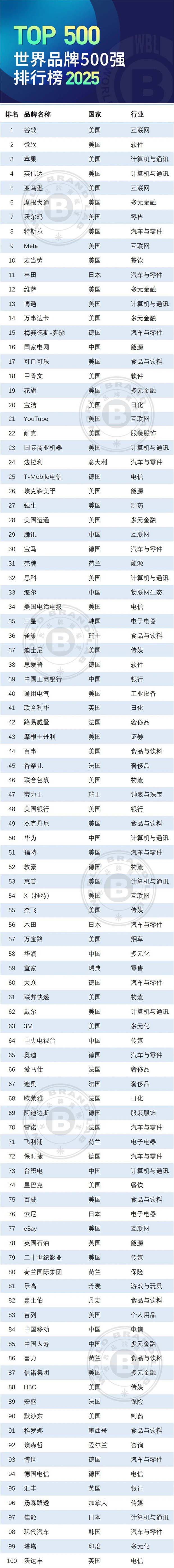由世界品牌实验室(World Brand Lab)独家编制的2025年度(第二十二届)《世界品牌500强》排行榜于12月17日在美国纽约揭晓,并在香港举行发布会。美国占据500强中的184席,稳居品牌大国第一。法国、中国、日本和英国为世界品牌大国的第二阵营。中国品牌入选数(50个)再次超越日本(40个),稳居全球第三。其中表现亮眼的品牌有国家电网、腾讯、海尔、华润、中国五矿、中国南方电网、五粮液、保利、中国国航等,纺织服装行业中,恒力(第347位)、盛虹(第369位)、魏桥(第387位)、波司登(第449位)等入选。