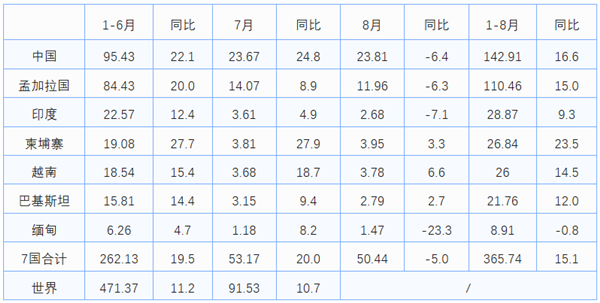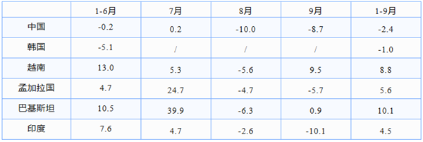 2025年1-9月,多国出口动力有所减弱。中国服装出口同比下降2.4%,降幅比1-6月扩大2.2个百分点。其中,对欧盟出口增速放缓至5.9%;对美国出口同比下降8.2%,降幅比1-6月扩大6.6个百分点;对东盟出口同比下降17.7%,但对菲律宾、印度尼西亚和柬埔寨出口同比分别增长6.9%、19.0%和64.9%。1-9月,越南对美国服装出口份额最大,但增速放缓至12.3%;在8月7日美国对越南关税由46%降至20%后,9月对美国服装出口增速加快至16.6%。1-9月,孟加拉国服装出口同比增长5.6%,增速比1-6月加快0.9个百分点,7-9月对美国出口同比增长8.6%,对欧盟出口同比增长3.6%。