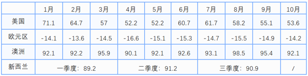 注:美国:设定1966年第一季度的结果为100。欧元区:-100表示极度缺乏信心、0中立和100极端信心。澳洲:指数高于100,表明乐观者多于悲观者。新西兰:高于100表示乐观多于悲观,低于100表示悲观。