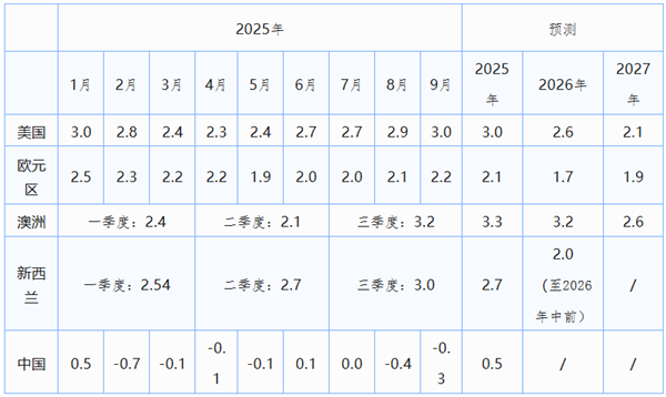预计2025年全年,美国、澳大利亚通胀水平逐步升温,欧元区通胀态势较为稳定,新西兰通胀则逐步回落。