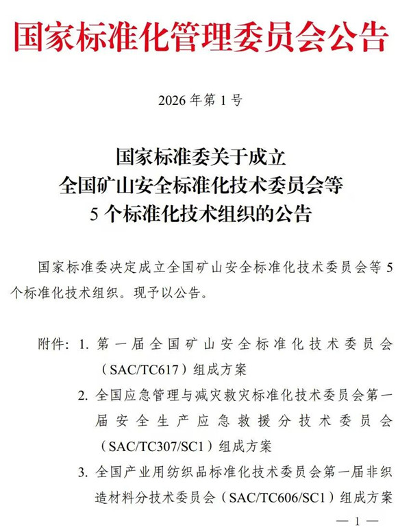 近日,国家标准化管理委员会发布2026年第1号公告,正式批准成立全国产业用纺织品标准化技术委员会非织造材料分技术委员会(SAC/TC606/SC1)和过滤分离用纺织材料分技术委员会(SAC/TC606/SC2)。两个标准化分技术组织的成立,标志着我国产业用纺织品行业在细分领域标准化建设上迈出关键步伐。