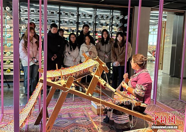 “织锦时,首先要把经线拉直。”在湖南张家界乖幺妹土家织锦艺术馆内,市级非遗代表性传承人张甜甜一边在织机上娴熟操作,一边向围拢的吉首大学和张家界旅游职业学校的学生们讲解。