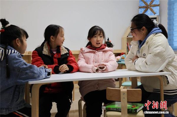 志愿者在“妈妈工厂”辅导员工的孩子学习。吴勇兵 摄