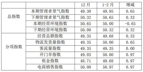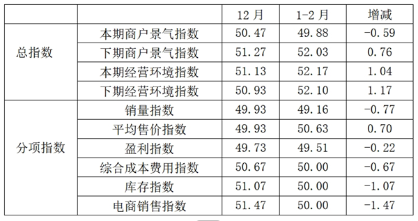 从商户景气指数来看,总指数中,1-2月商户景气指数为49.88, 较上期下降0.59个百分点;经营环境指数为52.17, 较上期上升1.04个百分点。