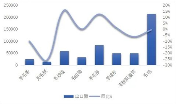 受到毛纺产品海外市场需求的调整,不同毛纺产品品类的出口形势并不相同。1-8月,毛纱线出口量价同增,累计出口数量同比增长8.2%,累计出口金额同比增长16.0%。