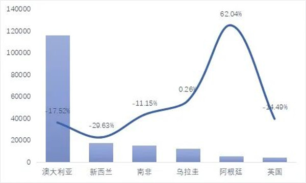 羊毛条出口则呈现量价齐跌,累计出口数量同比回落2.6%,累计出口金额同比跌幅则为9.9%。其中,羊毛条对欧盟出口下滑较快,出口数量同比下滑26.1%。但对印度、东盟、英国的羊毛条出口有明显增长,累计出口数量增速分别为16.8%、43%和39.2%。