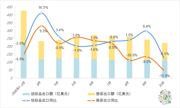 图1 2025年1~10月全国纺织品、服装出口月度统计