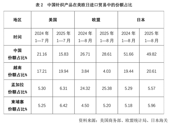 从主要出口市场来看,1—9月我国针织产品对美国出口147.25亿美元,同比下降7.23%。受美国关税政策扰动,订单转移趋势加剧等影响,短期下行压力显著,其中9月当月对美出口同比降幅扩大至16.39%。另据美国商务部数据显示,今年1—7月我国针织产品在美国进口贸易额中的占比为15.83%,较上年同期下降了5.33个百分点;同期,越南、孟加拉国和柬埔寨的份额占比分别提高了2.73、1.01和1.17个百分点,反映出美国市场订单的变化走向。