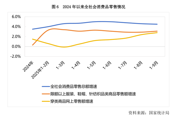 线上消费渠道成为激活内销潜力的重要引擎,新模式、新场景加速渗透。即时零售、直播带货、社交电商等新兴消费模式快速增长,带动前三季度网上零售额同比增长9.8%,展现出强劲的增长活力。同期实物商品网上穿类商品零售额同比增长2.8%,增速相对温和,消费需求仍需进一步激活。