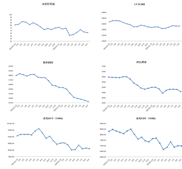 图1为我国主要化纤长丝、棉花、PTA期货及布伦特原油价格走势变化情况。