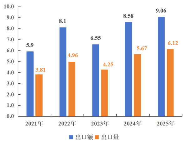 图2 我国锦纶长丝织物2021年~2025年1~9月同期出口量额(亿米/亿美元)