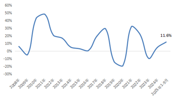 根据国家统计局数据,2025年1-9月化纤产量同比增长5.6%,产量增速较2024年同期和全年均有所放缓,但较1-6月小幅提升0.69个百分点,总体来看基本保持平稳(图1)。