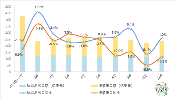 图1 2025年1~11月全国纺织品、服装出口月度统计