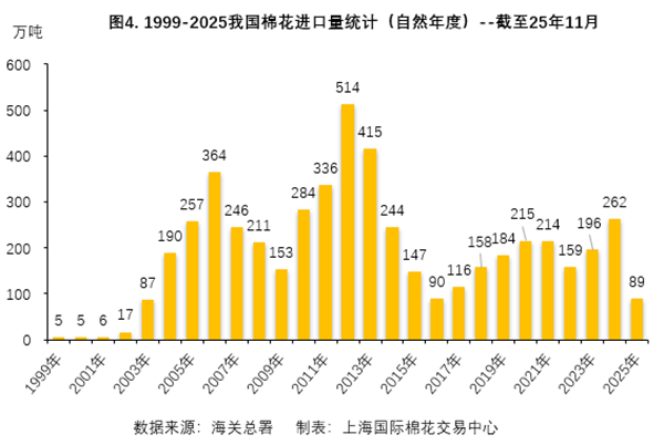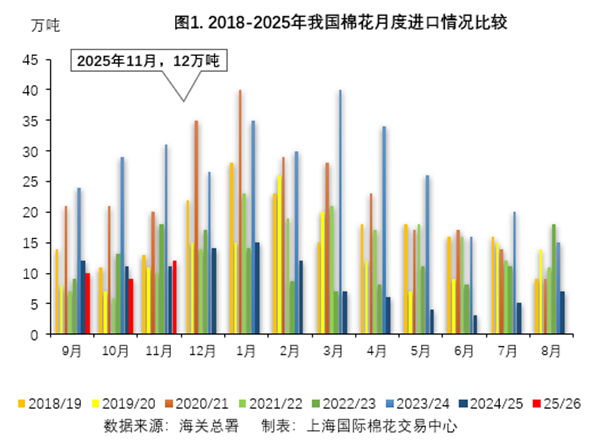 海关总署12月18日公布的数据显示,中国2025年11月棉花进口量为12万吨,同比增长9.4%。中国1-11月累计进口棉花89万吨,同比减少64%。