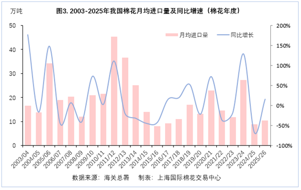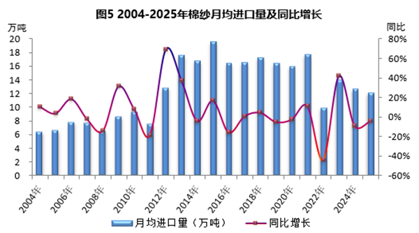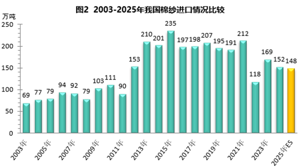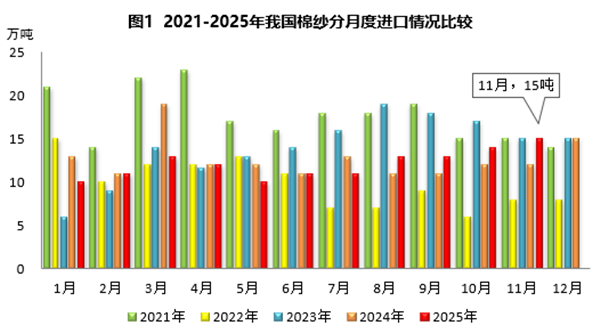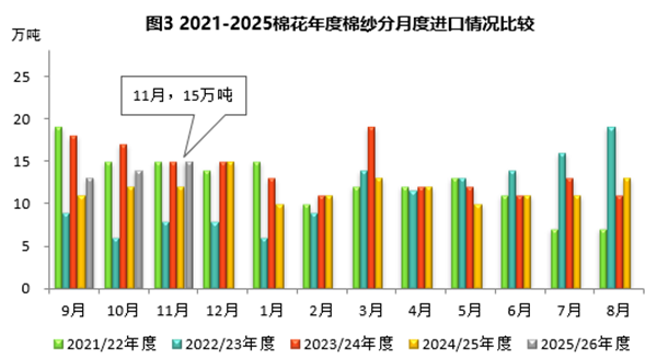 据海关统计数据,2025年11月我国棉纱进口量15万吨,环比增加1万吨,增幅为7.7%,同比增加3万吨,增幅为25%。2025年1-11月累计进口棉纱133万吨,同比减幅2.92%。