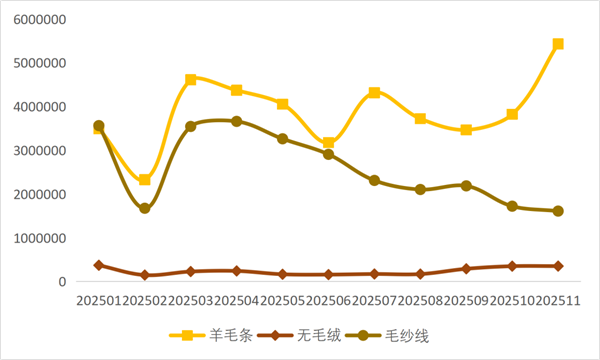 2025年1-11月,毛纺原料与制品的进出口形势持续恢复,原料需求增长。根据中国海关数据,1-11月,毛纺原料进出口总额147亿美元(人民币金额1052亿元),同比下跌1.8%。其中,毛纺原料及制品出口额112亿美元(人民币金额805亿元),同比下跌0.1%,进口额34.5亿美元(人民币金额247亿元),同比下跌7.5%。