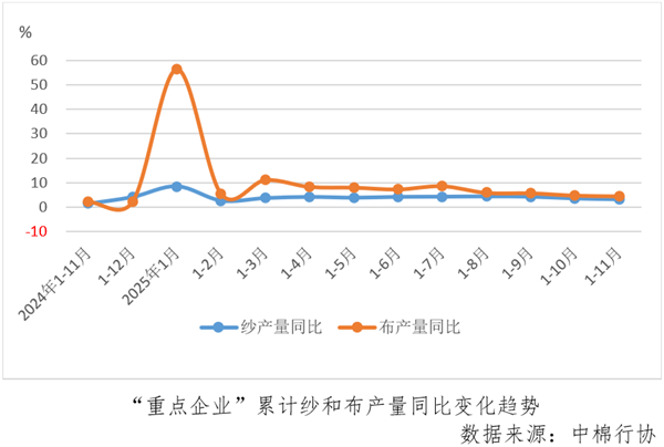 1-11月份,“重点企业”纱产量同比增长3.1%,布产量同比增长4.5%,均较1-10月份增速放缓0.3个百分点。11月份当月纱产量环比增长2.8%,布产量环比增长8.5%,均由上月环比下降转为增长。