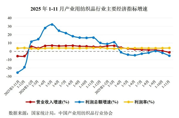2025年1-11月,全球经济在关税政策演变、地缘冲突扰动、有效需求不足等多重风险积聚下仍面临较大下行压力;国内经济运行延续总体平稳、稳中有进发展态势,消费潜力持续释放,外贸进出口稳中有升。我国产业用纺织品行业经济运行稳中趋缓,行业生产和出口保持稳定,盈利能力依然承压。