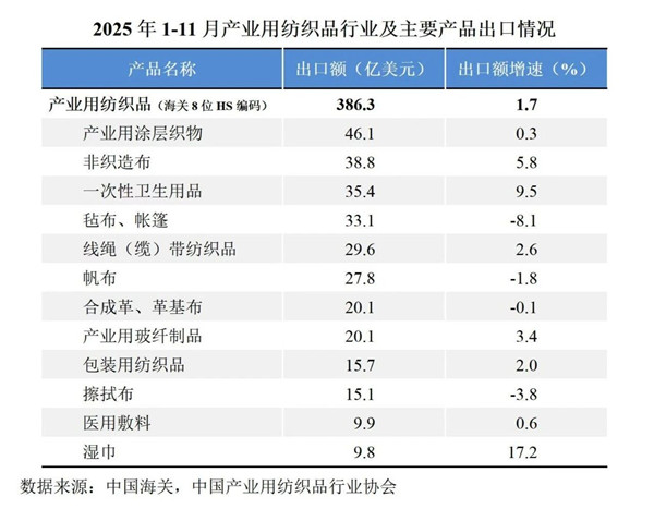 国际贸易方面,根据中国海关数据(海关8位HS编码统计数据),2025年1-11月我国产业用纺织品行业的出口额为386.3亿美元,同比增长1.7%;行业进口额为49.9亿美元,同比增长3.8%。
