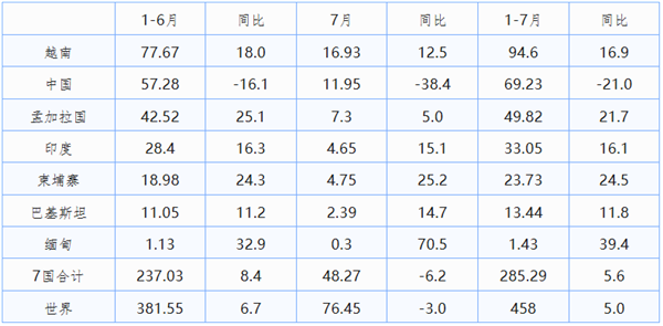 2025年1-9月,多国出口动力有所减弱。中国服装出口同比下降2.4%,降幅比1-6月扩大2.2个百分点。其中,对欧盟出口增速放缓至5.9%;对美国出口同比下降8.2%,降幅比1-6月扩大6.6个百分点;对东盟出口同比下降17.7%,但对菲律宾、印度尼西亚和柬埔寨出口同比分别增长6.9%、19.0%和64.9%。1-9月,越南对美国服装出口份额最大,但增速放缓至12.3%;在8月7日美国对越南关税由46%降至20%后,9月对美国服装出口增速加快至16.6%。1-9月,孟加拉国服装出口同比增长5.6%,增速比1-6月加快0.9个百分点,7-9月对美国出口同比增长8.6%,对欧盟出口同比增长3.6%。