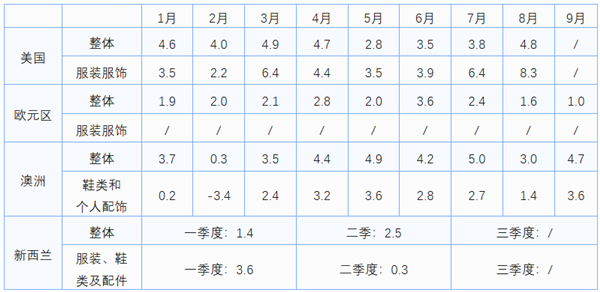 2025年1-8月,美国服装配饰店零售额同比增长5.1%,增速比1-6月加快0.8个百分点;7、8、9月,澳大利亚服装、鞋类和配饰零售同比分别增长2.7%、1.4%和3.6%;二季度,新西兰服装鞋类和配饰零售同比增长0.3%,增速比一季度放缓3.3个百分点。