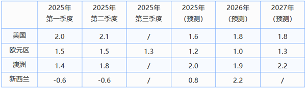 预计2025年第四季度欧美宏观经济增速放缓,澳大利亚保持较高增速,新西兰增速实现回升。
