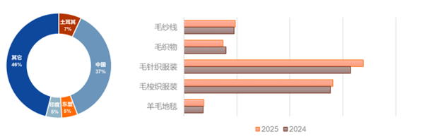 从左至右分别为:欧盟进口区外毛纺产品地区进口额份额;2024-2025年1-10月欧盟进口主要毛纺产品进口额情况(单位:欧元)