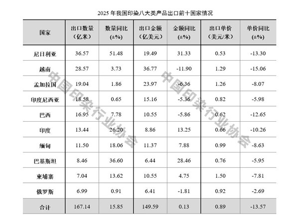 2025年,我国印染行业对出口数量排名前十的国家出口规模达到167.14亿米,同比大幅增长15.85%,占出口总量的45.19%,占比较2024年提高2.03个百分点,出口集中度进一步提高。尼日利亚对出口数量增长的贡献率达到54.34%,全年对尼日利亚出口数量36.57亿米,同比大幅增长51.48%。此外,对巴基斯坦、印度、缅甸、柬埔寨等国家的出口数量增速也明显高于整体出口水平,对越南、孟加拉国等传统市场的出口增速显著低于整体水平,反映出在美国关税政策影响下,我国印染行业积极调整市场结构,加快拓展新兴市场发展空间,以产业韧性有效应对外部冲击。对前十国家出口平均单价均呈现下降态势,其中对越南下降15.06%,降幅居前十国家首位。