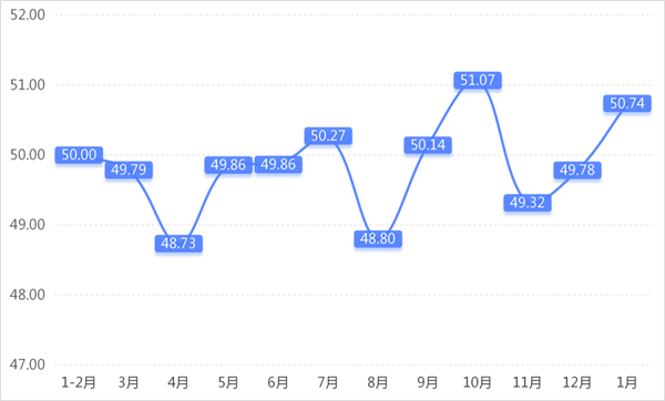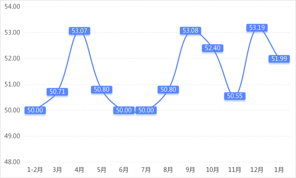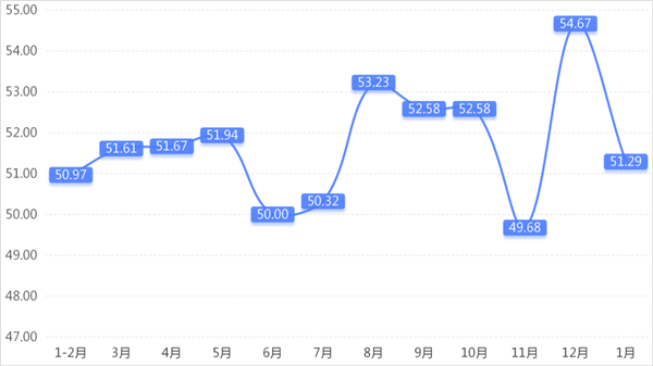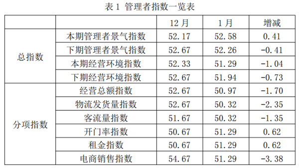 从管理者景气指数来看,总指数中,1月管理者景气指数为52.58,较上期上升0.41个百分点;经营环境指数为51.29,较上期下降1.04个百分点。