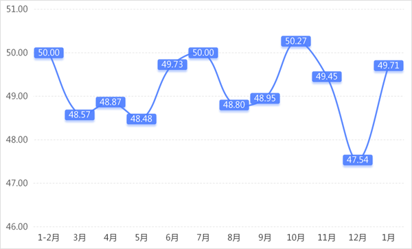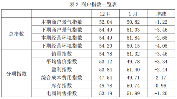 从商户景气指数来看,总指数中,1月商户景气指数为50.82,较上期下降1.22个百分点;经营环境指数为51.84,较上期下降2.65个百分点。