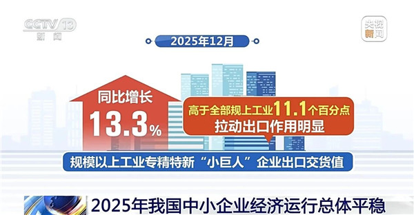 专精特新中小企业表现亮眼。2025年,规模以上工业专精特新“小巨人”企业增加值同比增长9.0%,利润总额同比增长7.0%,营收利润率达7.9%,均高于全部规模以上工业,综合竞争力进一步增强。出口方面保持强劲势头。2025年12月,中小企业出口指数为52.4%,连续21个月处于扩张区间。规模以上工业专精特新“小巨人”企业出口交货值同比增长13.3%,高于全部规上工业11.1个百分点,拉动出口作用明显。