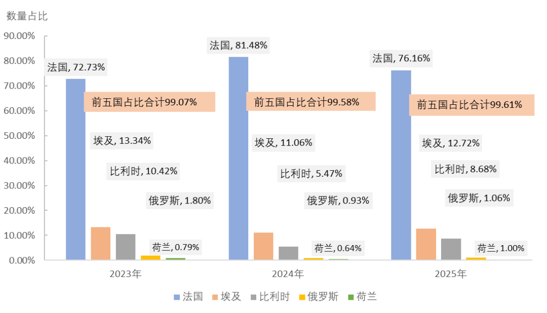 根据中国海关统计数据,2025年中国亚麻打成麻进口国别为法国、埃及、比利时、俄罗斯、荷兰、白俄罗斯、拉脱维亚、印度、英国9个国家,比2024年增加了2个,其中法国、埃及、比利时、俄罗斯和荷兰依序为中国亚麻进口前五位国家,合计数量占比超过99%,且各自占比有升降(见图5)。