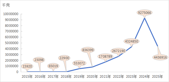 图3 2015~2025年中国亚麻纤维进口数量统计