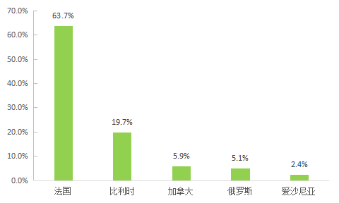 根据中国海关统计数据,2025年中国汉麻纤维进口4437吨,比2024年下降52.16%(见图9),回落到比2023年小幅增长2.59%的水平。汉麻的主要进口国包括法国、俄罗斯、荷兰、乌克兰和比利时,其中自法国和比利时的进口数量占比分别为74.29%和3.26%,相对应的2024年占比分别为63.66%和19.73%(见图10、图11)。汉麻进口数量的锐减与2024年我国东北汉麻种植面积大幅增加以及2024年欧洲亚麻丰收有关。