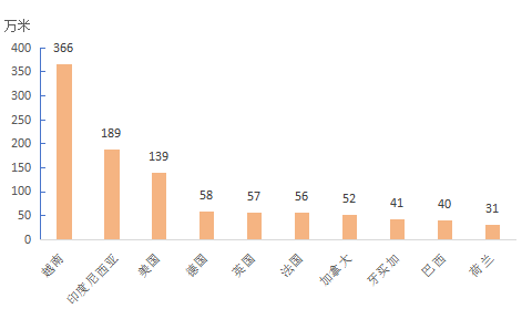 2025年我国黄麻纱线和织物出口分别为3203.9吨和1444.6万米,与2024年同比分别下降2.00%和增长23.36%。黄麻纱线和织物主要出口国别见图13、图14。