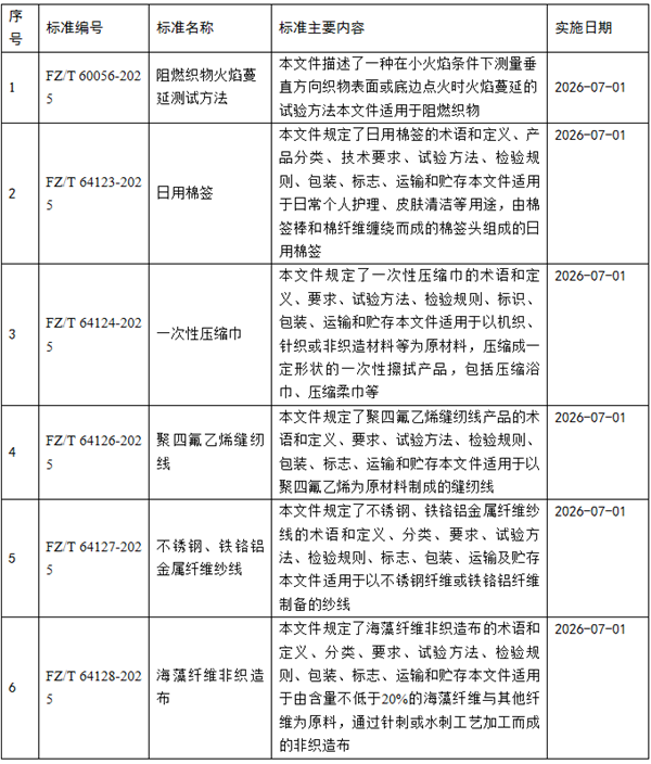 近期,中华人民共和国工业和信息化部发布公告(2025年 第41号),批准《电动汽车运行碳减排量评估方法》《个人信息保护术语》等748项行业标准,其中包括6项产业用纺织品行业标准,详情见下表。