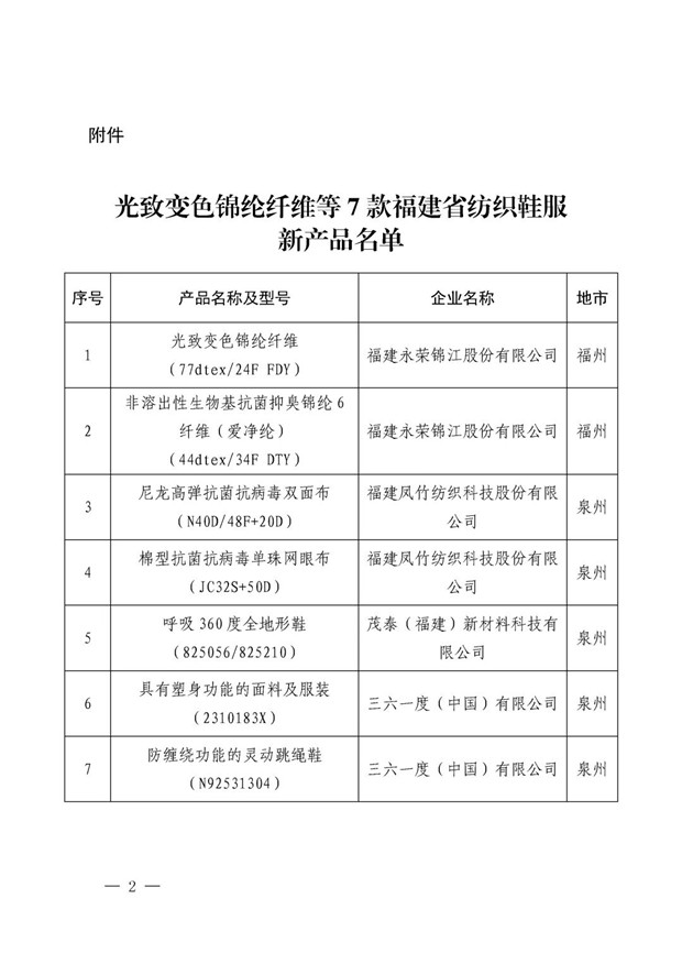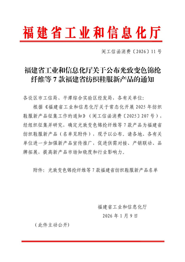 近日,福建省工业和信息化厅依据《关于常态化开展2025年纺织鞋服新产品征集工作的通知》(闽工信函消费〔2025〕207号)要求,经组织征集与严格评审,正式确定光致变色锦纶纤维等7款产品为福建省纺织鞋服新产品,其中福建凤竹纺织两款面料进入名单(名单见下方)。