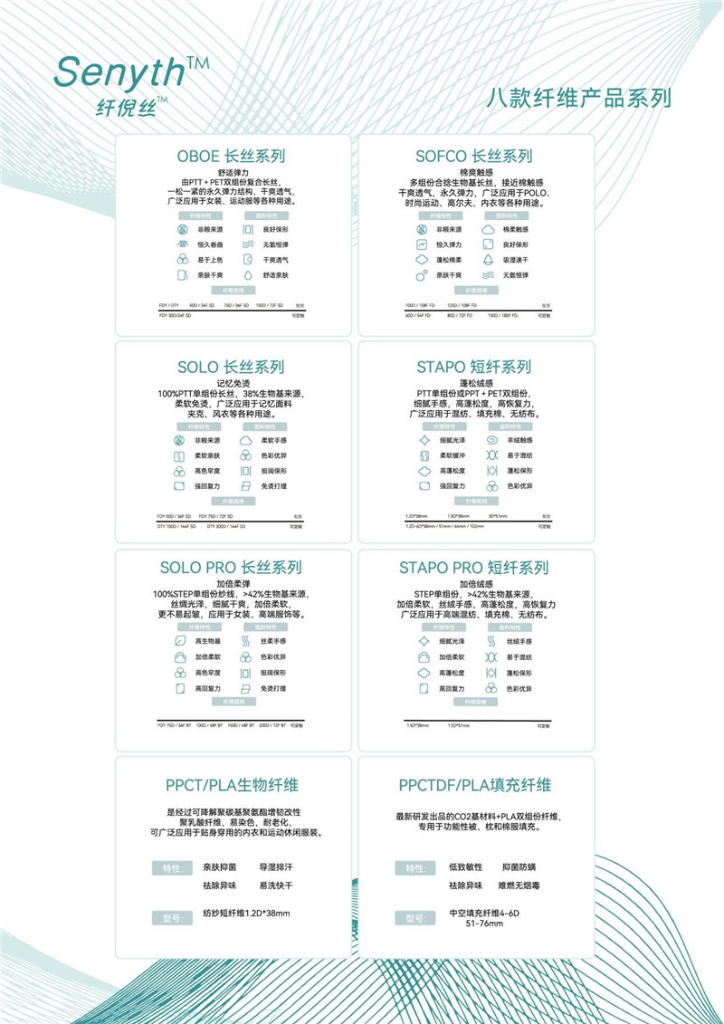 目前,Senyth™ 拥有非粮生物基聚酯PTT及系列纤维(SOLO、OBOE、SOFCO、STAPO)及全新推出的非粮生物基聚酯弹性体STEP及系列纤维(SOLO Pro、STAPO Pro),以及PPCT/PLA生物纤维和PPCTDF/PLA填充纤维。