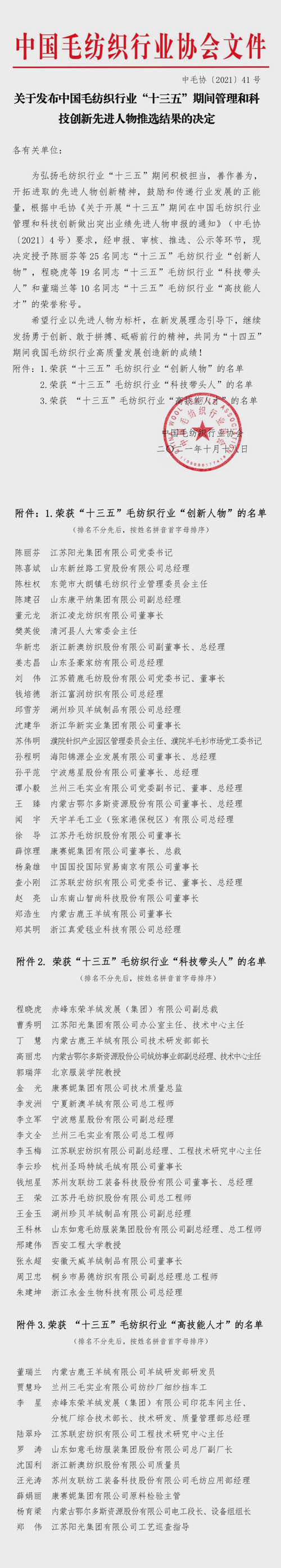 中国毛纺织行业协会会长刘家强宣读了《中国毛纺织行业“十三五”期间管理和科技创新先进人物推选决定》(名单附后)。