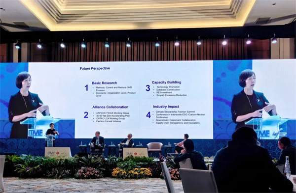 在“可持续、法规和关税”议题环节,中国纺联副会长阎岩以“可持续引领发展——中国纺织政策框架和协同行动”为题,进行了发言。在未来展望中,她呼吁,应聚焦于四个主要方面:基础研究——探索控制和减少温室气体排放的方法,并在组织层面和产品层面制定相关标准;联盟合作——通过包括参与UNFCCC FICCA工作组、实施30·60净零加速计划、加入CNTAC-LCA工作组以及推进时尚森林倡议,加强合作与行动;能力建设——致力于技术推广、数据库建设、可再生能源投资以及Scope3排放的减少;行业影响——通过举办气候管理时尚峰会、参与洲际纺织ESG/碳中和会议、与下游客户合作,以及提升供应链的透明度和可追溯性,来推动整个行业的进步与发展。