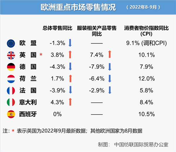 随着9月英国通胀率攀升至10.1%,英国消费者的信心接近历史低点,当月英国零售额环比下降1.4%,降幅超出市场预期。英国9月纺织品、服装和鞋类产品销售额达49.5亿英镑(约57.5亿美元),同比增长7.4%。