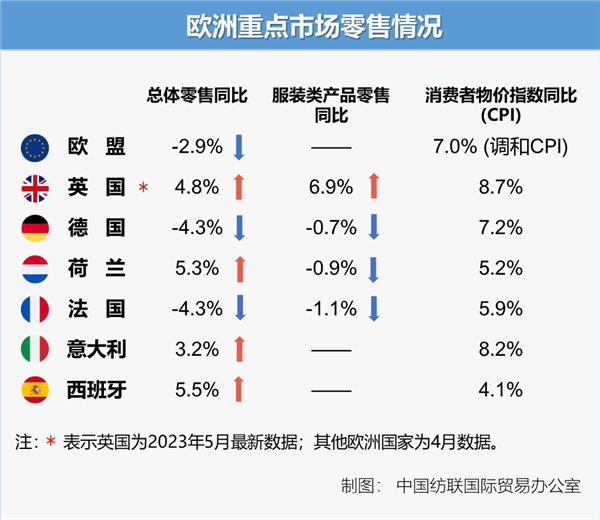 4月,德国服装零售额同比略降0.7%;荷兰服装零售额同比减少0.9%;法国纺织服装和皮革制品家庭消费额达41亿欧元(约44.8亿美元),同比下滑1.1%。