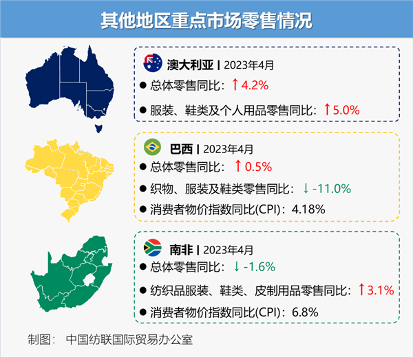 今年4月,南非通胀率回落至6.8%。当月,南非纺织品、服装、鞋类和皮制用品零售额为171.7亿兰特(约9.2亿美元),同比增长3.1%。