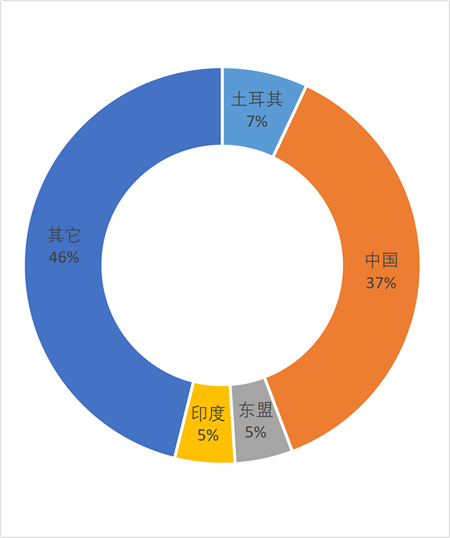 2025年1~9月美国进口毛纺产品主要进口地进口额占比情况(单位:%)