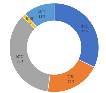 2025年1~10月欧盟进口毛纺产品主要进口地进口额占比情况(单位:%)