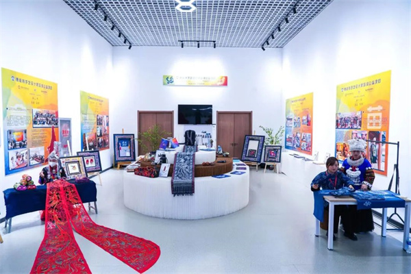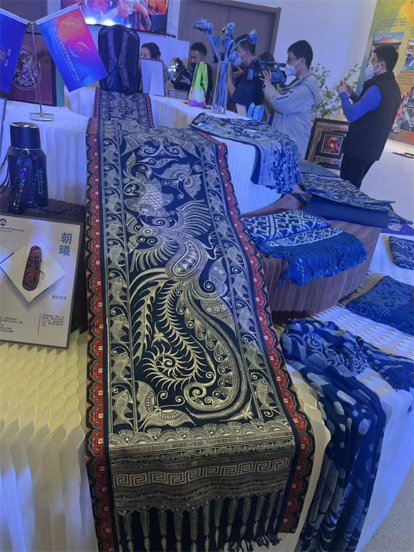 本次非遗大会会场设立的“博柏利手艺设计师培训公益项目”专展,展示了融合蜡染技艺制作的桌旗和餐垫、瑶族刺绣纹样的电脑包、融合畲绣、织锦与中国剪纸等传统艺术的《有凤来仪》手作等作品,这些将少数民族传统手工艺与现代生活用品相结合的产品,吸引了众多与会嘉宾的关注,不少参展企业与项目学员洽谈合作意向。