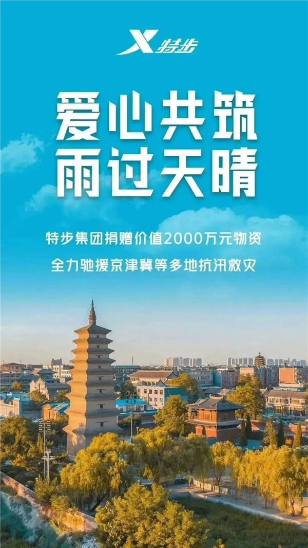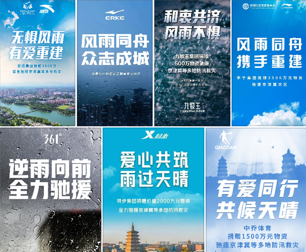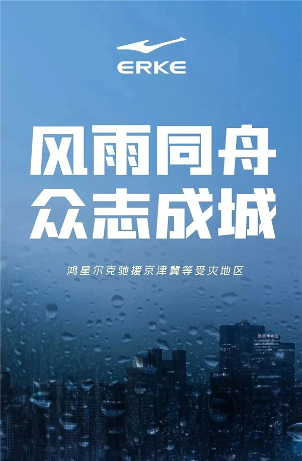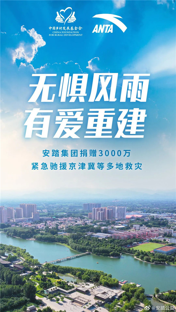 “无惧风雨,有爱重建”,安踏集团向中国乡村发展基金会紧急捐赠3000万元,包括2000万元物资及1000万元现金,用于响应京津冀及福建泉州受灾地区的灾情救助需求,保障受灾群众人身安全和过渡安置,采购紧急救灾物资和救援设备,并帮助地区灾后重建与复工复产。