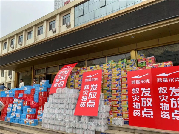 “风雨同舟,众志成城”,鸿星尔克救灾指挥小组紧急调动人力物力驰援京津冀灾区,于救灾物资发放点为抗洪救灾的一线工作者及受灾群众发放食品、饮用水、装备等应急物资。