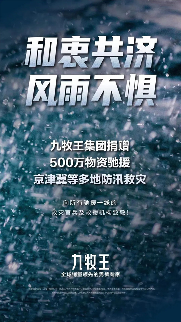 “和衷共济,风雨不惧”,中国服装协会副会长单位——九牧王股份有限公司携旗下品牌九牧王男裤专家、FUN、ZIOZIA紧急捐赠物资500万元,驰援防汛救灾,用于保障京津冀及泉州等受灾地区的人员安全、应急救援和灾后重建等工作。